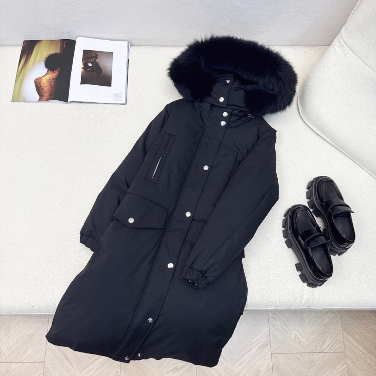 Prada thick down coat with large fox fur collar and fitted waist-5352